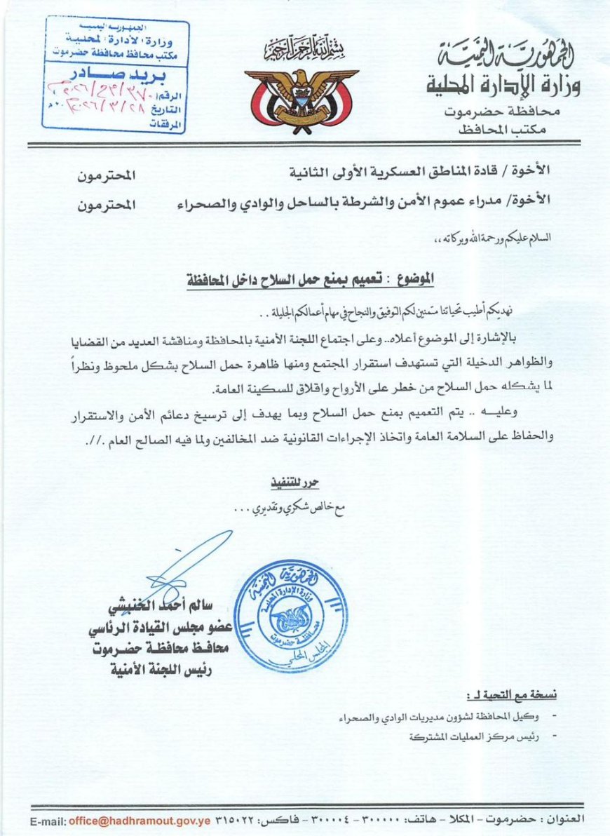 الخنبشي يصدر تعميماً صارماً بمنع حمل السلاح لتعزيز الأمن والاستقرار.. وثيقة