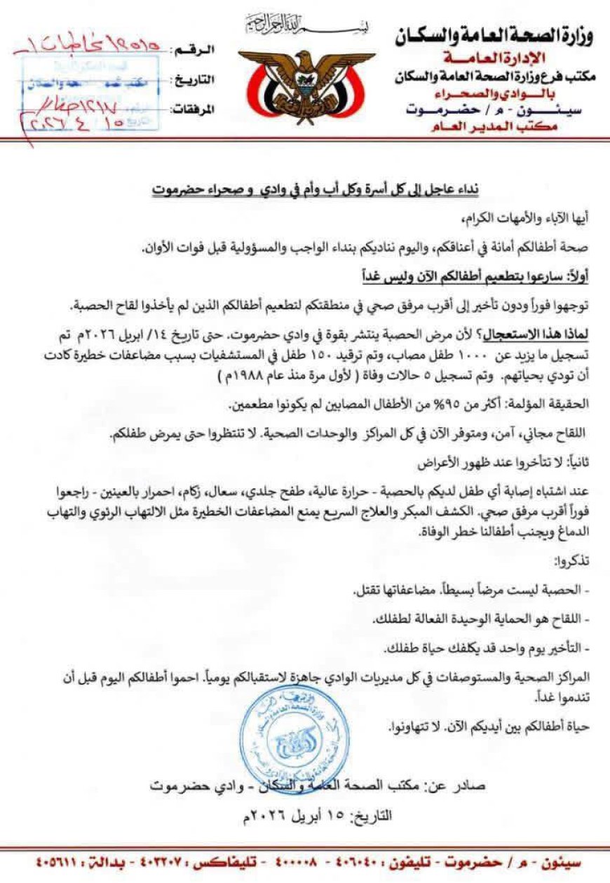 أطلق مكتب وزارة الصحة العامة والسكان بوادي وصحراء حضرموت نداءً عاجلًا للأسر للإسراع في تطعيم الأطفال ضد الحصبة بعد تسجيل انتشار ملحوظ للمرض في مناطق الوادي.